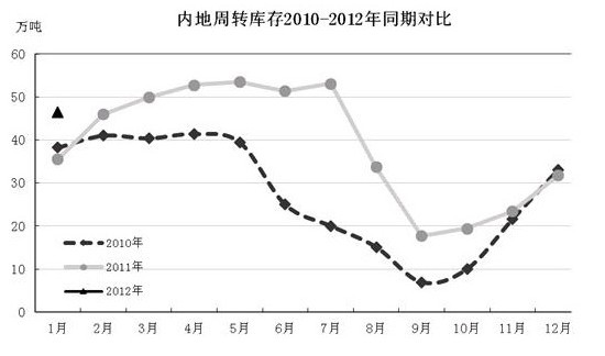 中國棉花協(xié)會(huì)棉花倉儲(chǔ)分會(huì)對(duì)120家倉儲(chǔ)會(huì)員單位統(tǒng)計(jì),截至2012年1月底,商品棉周轉(zhuǎn)庫存總量為108.1萬噸(其中內(nèi)地46.5萬噸、新疆61.6萬噸),環(huán)比增加8.4萬噸,同比減少36.3萬噸。據(jù)此推算,全國商品棉周轉(zhuǎn)庫存總量約為122.9萬噸,較上月增加11.7萬噸。當(dāng)月,新疆21家中轉(zhuǎn)站點(diǎn)通過鐵路共向內(nèi)地發(fā)運(yùn)棉花18.1萬噸,環(huán)比增加0.3萬噸。