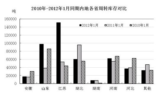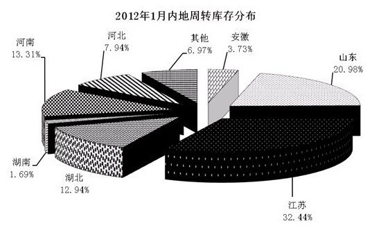 從當(dāng)月內(nèi)地庫存分布來看,江蘇庫存量仍為最大,接近全國1/3,其次是山東、河南和湖北。其中江蘇32%,較上月下降5個(gè)百分點(diǎn);山東20%,較上月上升5個(gè)百分點(diǎn);河南13%,較上月上升1個(gè)百分點(diǎn);湖北12%,較上月上升2個(gè)百分點(diǎn);安徽3%,較上月下降2個(gè)百分點(diǎn);河北7%,較上月沒有變化。