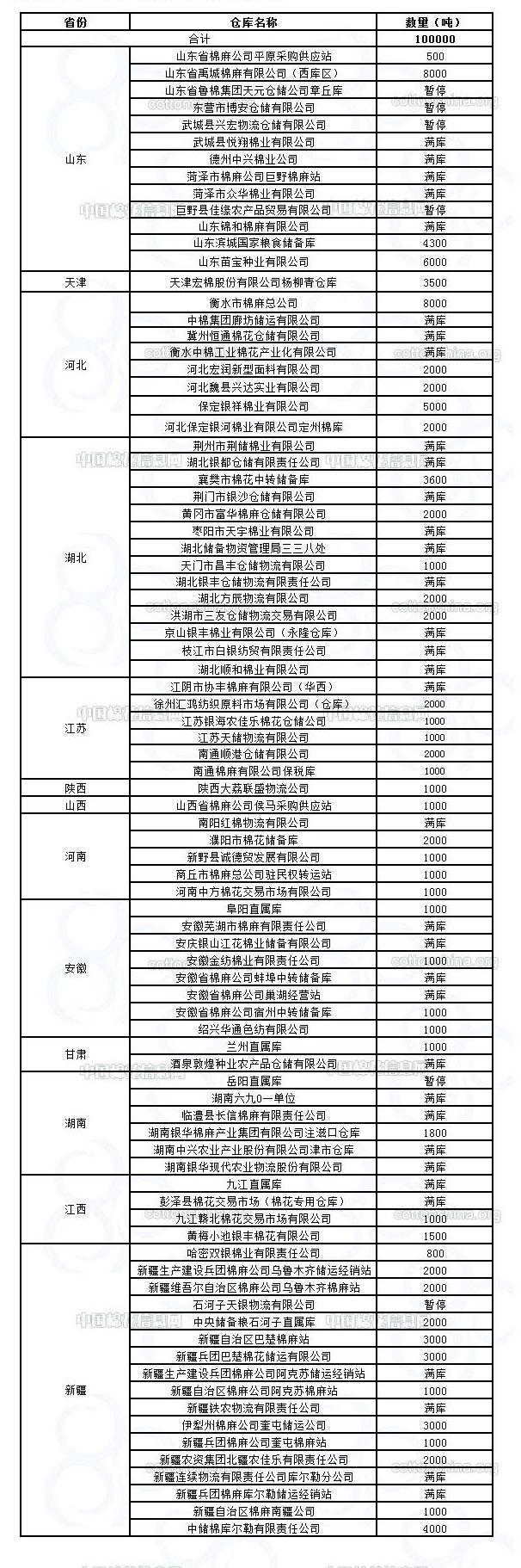 2月29日在以下指定倉(cāng)庫(kù)收儲(chǔ)2011年度棉花100000噸。