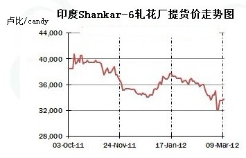 自印度政府3月5日發(fā)布棉花出口禁令以來,其國內棉價大幅走高,12日Shankar-6軋花廠提貨價約33500-34000盧比/candy,折87.25美分/磅,較6日漲5.12美分。