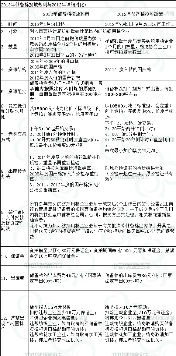 受到棉花業(yè)內(nèi)普遍關(guān)注的2013年國(guó)家儲(chǔ)備棉投放工作于今日正式開(kāi)始了,與2012年9月的儲(chǔ)備棉投放工作相比,此次規(guī)則有一些變化,值得我們關(guān)注,具體有以下幾點(diǎn):