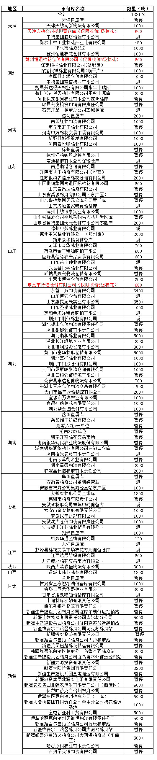 定于1月6日在以下指定倉庫收儲2012年度棉花132170噸。哈密雙銀棉業(yè)有限責(zé)任公司僅限東疆棉花企業(yè)競拍,新疆維吾爾自治區(qū)棉麻公司博樂棉麻站僅限于博樂地區(qū)棉花企業(yè)競拍,以上庫點(diǎn)其他地區(qū)企業(yè)競拍將按違約處理。