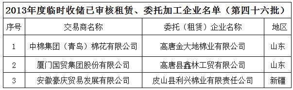 2013年度棉花臨時收儲已審核租賃、委托加工企業(yè)名單(第四十六批)