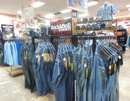 離開孟菲斯的棉花分級辦公室后,飛抵德州拉伯克時已是下午三點多了。趁著距離晚餐還有兩個小時時間,領隊毛凱琳見縫插針帶我們訪問了當地的一家專營馬靴和西部牛仔服裝的主題商店——DollarWesternWear。這里出售的商品全部是德州最具代表性的服飾,從各種水洗風格的牛仔服和牛仔褲、牛仔帽、牛仔靴,到牛仔隨身攜帶的各種刀具和皮質錢夾,可以從頭到腳裝備一身美國電影中西部牛仔的整套行頭。靴子不僅圖案精美,種類繁多,而且靴子上面還有德州Texas的T字頭標志,不僅可以騎馬時穿著,還有獨特的原產地紀念意義。
