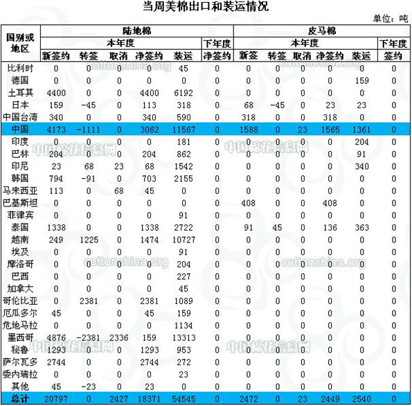 當(dāng)周中國凈簽約本年度陸地棉3062噸,裝運(yùn)11567噸;凈簽約本年度皮馬棉1565噸,裝運(yùn)1361噸。