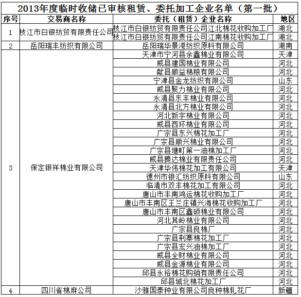2013年棉花度臨時收儲已審核租賃、委托加工企業(yè)名單(第一批)