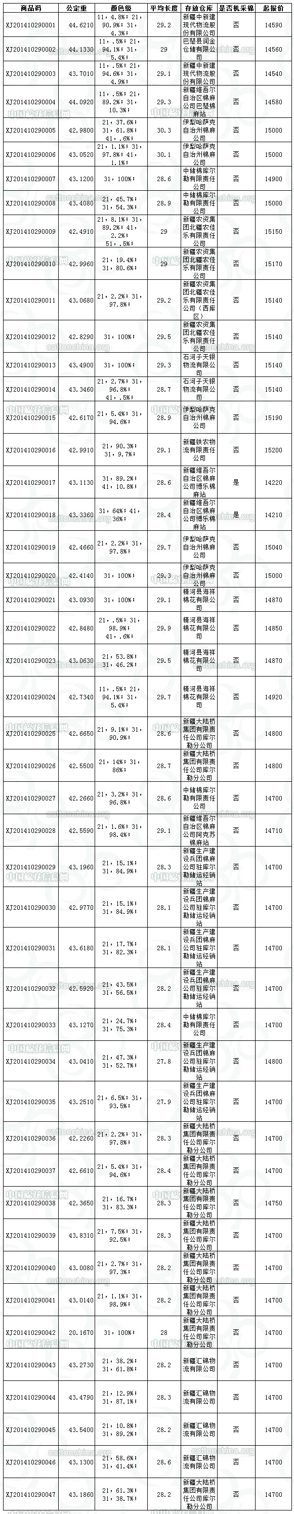 各交易商: 定于10月29日推出新疆棉競(jìng)賣(mài)棉花2001.7240噸,其中手摘棉1915.275噸,機(jī)采棉86.449噸。最低起報(bào)價(jià)14210元/噸,最高起報(bào)價(jià)15200元/噸。相關(guān)詳細(xì)數(shù)據(jù)見(jiàn)附件。具體庫(kù)點(diǎn)如下:
