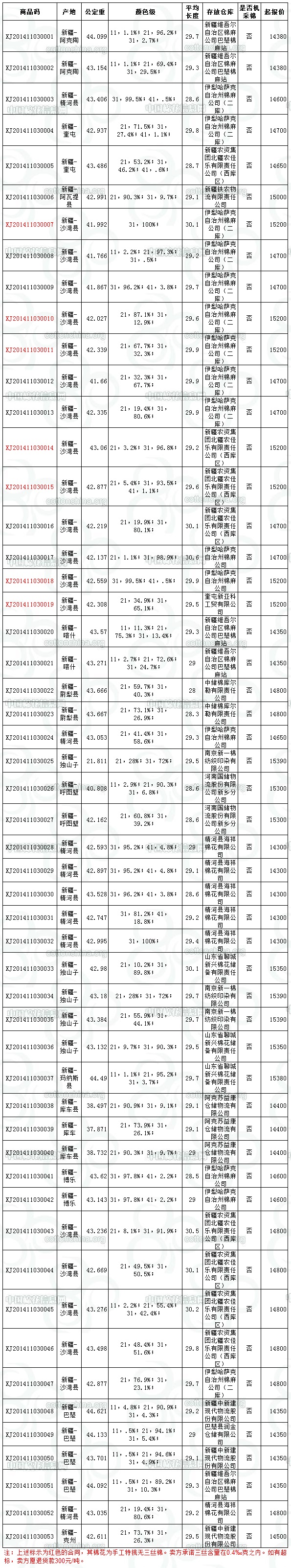 各交易商: 定于11月3日推出新疆棉競(jìng)賣資源2242.765噸,全為手摘棉。其中新疆庫(kù)資源量為1920.818噸(最低起報(bào)價(jià)14300元/噸),內(nèi)地庫(kù)資源量為321.947噸(最低起報(bào)價(jià)為15300元/噸)。當(dāng)日總競(jìng)賣資源中有7批手工特挑無(wú)三絲棉(最低起報(bào)價(jià)15200元/噸)。賣方承諾三絲含量在0.4‰克之內(nèi)。如有超標(biāo),賣方愿退貨款300元/噸。相關(guān)詳細(xì)數(shù)據(jù)見附件。具體庫(kù)點(diǎn)如下: