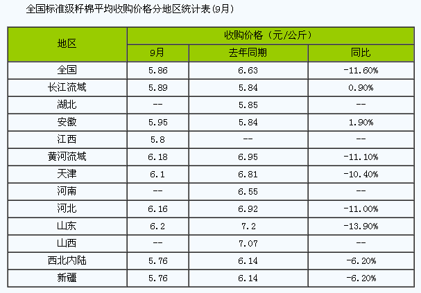 全國(guó)400型加工企業(yè)3128級(jí)籽棉9月平均收購(gòu)價(jià)格5.86元/公斤,同比下跌0.77元/公斤,跌幅11.6%,其中新疆收購(gòu)價(jià)格為5.76元/公斤,同比下跌0.38元/公斤,跌幅6.2%;黃河流域收購(gòu)價(jià)格最高,但普遍低于去年,收購(gòu)均價(jià)為6.18元/公斤左右,同比下跌0.77元/公斤,跌幅11.1%,長(zhǎng)江流域收購(gòu)價(jià)格高于去年同期,為5.89元/公斤,同比上漲0.05元/公斤,漲幅0.9%。收購(gòu)籽棉,新疆以3128級(jí)為主,公檢后不少長(zhǎng)度只有27、26毫米,長(zhǎng)度偏短,白棉3128級(jí),衣分40.6%,回潮8.51%,雜質(zhì)1.86%,;內(nèi)地3127級(jí)為主,籽棉回潮率在13%以上,普遍高于標(biāo)準(zhǔn),新棉花質(zhì)量不容樂(lè)觀。