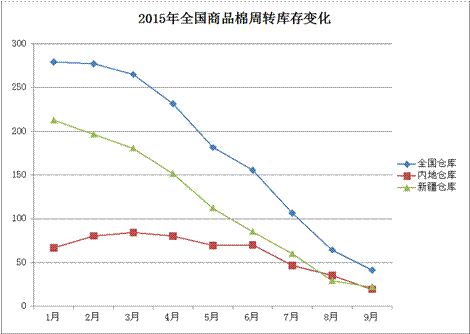 9月,進(jìn)入新年度,新棉逐漸上市,但由于皮棉市場疲軟,收購價格低于去年同期,棉農(nóng)觀望氣氛較濃,軋花廠收購謹(jǐn)慎,收購進(jìn)度較為遲緩,用棉企業(yè)繼續(xù)以消化陳棉為主,商品棉周轉(zhuǎn)庫存繼續(xù)大幅降低。根據(jù)對中國棉花協(xié)會物流分會在全國18個省市的222家棉花交割和監(jiān)管倉庫、社會倉庫、保稅區(qū)庫存和加工企業(yè)庫存調(diào)查,全國棉花商業(yè)庫存總量68萬噸,環(huán)比減少34%。