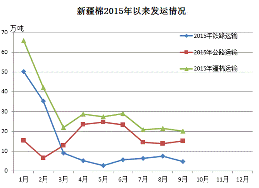 2015年1-9月,新疆棉共發(fā)運出疆277.1萬噸,其中鐵路出疆127.29萬噸,公路出疆149.81萬噸。