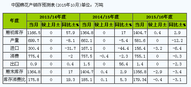 10月份,國(guó)內(nèi)產(chǎn)銷(xiāo)存預(yù)測(cè)數(shù)據(jù)與上月相比調(diào)整不大:調(diào)減2014/15年度國(guó)內(nèi)棉花消費(fèi)量0.4萬(wàn)噸至757.5萬(wàn)噸。調(diào)減2015/16年度國(guó)內(nèi)棉花進(jìn)口量3.2萬(wàn)噸至156.4萬(wàn)噸,2015/16年度國(guó)內(nèi)棉花期末庫(kù)存減少2.9萬(wàn)噸至1356.8萬(wàn)噸,期末庫(kù)存消費(fèi)比為179.34%,較上月下降3.1個(gè)百分點(diǎn)。