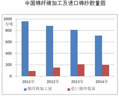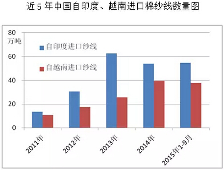 亞洲是全球棉花消費(fèi)增長(zhǎng)的主要地區(qū),其中印度、越南、印度尼西亞、孟加拉國(guó)等國(guó)家都表現(xiàn)出不同程度地增長(zhǎng)。其中重要原因之一是,中國(guó)進(jìn)口紗線數(shù)量的增長(zhǎng)替代了部分國(guó)內(nèi)棉紡織企業(yè)對(duì)棉花的直接消費(fèi),拉動(dòng)了棉花消費(fèi)增長(zhǎng)。根據(jù)海關(guān)數(shù)據(jù)顯示,2012~2014年期間,中國(guó)年均進(jìn)口棉紗線約190萬噸,2015年1-9月累計(jì)進(jìn)口數(shù)量同比增長(zhǎng)24.4%,預(yù)計(jì)短期內(nèi)大量進(jìn)口棉紗的局面或?qū)⒕S持一段時(shí)期。