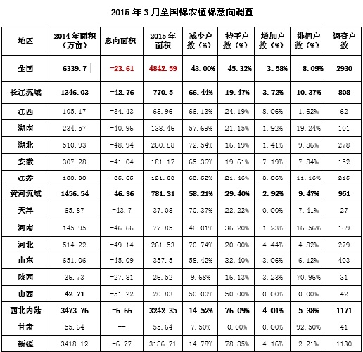 被調(diào)查的2930戶棉農(nóng)中,準(zhǔn)備減少植棉面積的棉農(nóng)占43%,準(zhǔn)備增加的棉農(nóng)占3.58%,與上年持平的占45.32%,尚在徘徊的占8.09%。與上月相比,徘徊戶因播種在即有所下降,多數(shù)轉(zhuǎn)為減少戶,持平戶,少數(shù)轉(zhuǎn)為增加。按照被調(diào)查棉農(nóng)植棉意向加權(quán)平均計算,全國棉農(nóng)平均種植意向減少23.61%,減幅較上月減少0.61個百分點,以協(xié)會2014年面積為基數(shù),預(yù)計2015年全國植棉面積4842.6萬畝。