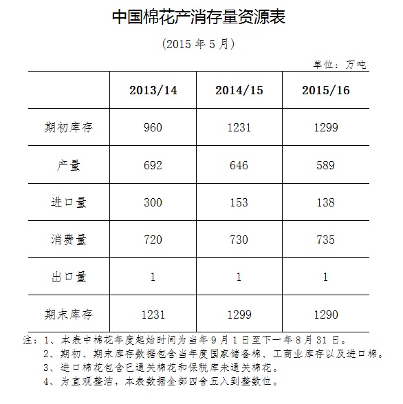 錦橋紡織網(wǎng)—資訊頻道> 棉花信息> 棉花動態(tài)>正文 中國棉花產(chǎn)消存量資源表(2015年5月)