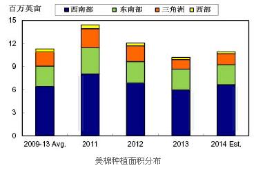 2014年,陸地棉種植將增長,長絨棉種植下降。在即將到來的年度,陸地棉種植面積在西南部和三角洲地區(qū)預(yù)計(jì)擴(kuò)大,在東南部和西部地區(qū)略有下降。西南部陸地棉種植面積預(yù)計(jì)接近670萬英畝,同比上漲但低于2011和2012年(圖二);占總種植面積的61%,為1920年以來的最高。三角洲地區(qū)有望增長17%的種植面積,約140萬英畝,但仍為歷史低點(diǎn),該地區(qū)種植面積預(yù)計(jì)占總數(shù)的13%。在東南部地區(qū),棉花種植面積約為260萬英畝,與上年度相近,低于近10年平均水平。東南部地區(qū)約占總面積的24%。西部地區(qū)由于灌溉問題,僅僅有24.5萬英畝的種植,僅占全部的2%。長絨棉種植在西部地區(qū)大大增長。