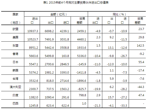 前4個月,我與東盟貿(mào)易總值為8951.2億元,增長1.5%,占我外貿(mào)總值的11.9%。其中,我對東盟出口5442.4億元,增長13.1%;自東盟進口3508.8億元,下降12.6%;對東盟貿(mào)易順差1933.6億元,擴大1.4倍。中日貿(mào)易總值為5547.1億元,下降11%,占我外貿(mào)總值的7.4%。其中,對日本出口2700.6億元,下降12%;自日本進口2846.5億元,下降10%;對日貿(mào)易逆差145.9億元,擴大55.4%。