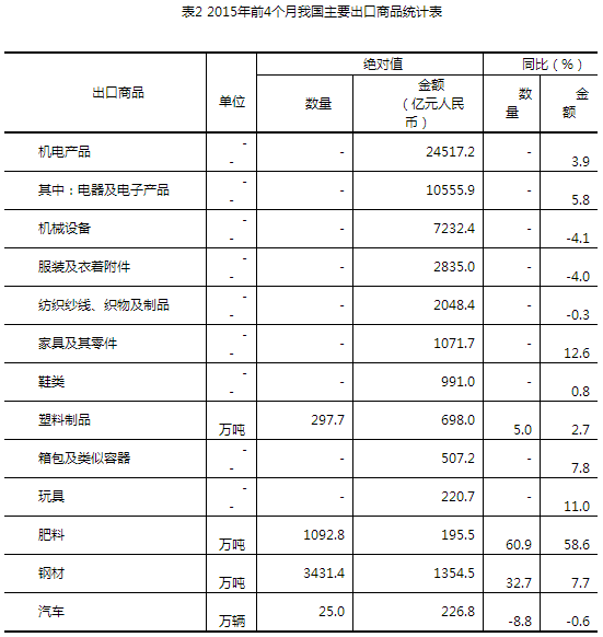 五、機電產(chǎn)品和傳統(tǒng)勞動密集型產(chǎn)品出口增長。前4個月,我國機電產(chǎn)品出口2.45萬億元,增長3.9%,占出口總值的57.9%。其中,電器及電子產(chǎn)品出口1.06萬億元,增長5.8%;機械設備7232.4億元,下降4.1%。同期,服裝出口2835億元,下降4%;紡織品2048.4億元,下降0.3%;家具1071.7億元,增長12.6%;鞋類991億元,增長0.8%;塑料制品698億元,增長2.7%;箱包507.2億元,增長7.8%;玩具220.7億元,增長11%;上述7大類勞動密集型產(chǎn)品合計出口8372億元,增長1%,占出口總值的19.8%。此外,肥料出口1092.8萬噸,增加60.9%;鋼材3431.4萬噸,增加32.7%;汽車25萬輛,減少8.8%(表2)。