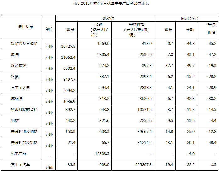 六、鐵礦砂、原油、糧食等主要大宗商品進口量增加,煤、成品油進口量減少,主要進口商品價格普遍下跌。前4個月,我國進口鐵礦砂3.07億噸,增加0.7%,進口均價為每噸413元,下跌45.2%;原油1.11億噸,增加7.8%,進口均價為每噸2536.9元,下跌47.2%;煤6902.4萬噸,減少37.7%,進口均價為每噸397.3元,下跌19.3%;成品油1036.9萬噸,減少6.7%,進口均價為每噸3020.5元,下跌38.2%;初級形狀的塑料892.7萬噸,增加3.7%,進口均價為每噸1.06萬元,下跌14.5%;鋼材443.2萬噸,減少9.5%,進口均價為每噸7255.6元,下跌4.4%;未鍛軋銅及銅材153.3萬噸,減少14%,進口均價為每噸3.97萬元,下跌12.8%。