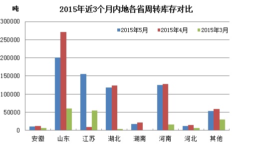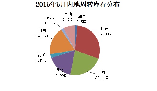 從內(nèi)地庫存量來看,山東庫存量依舊最大,其次是江蘇、河南;從庫存變化看,山東庫存量下降最明顯,環(huán)比下降7萬噸,減幅25.8%,占同期內(nèi)地庫存的29.03%,占比較上月下降4.8個百分點;其次是江蘇,庫存量15.6萬噸,環(huán)比下降1.6萬噸,在內(nèi)地庫存中的占比為22.4%;此外庫存量在10萬噸以上的省份還有河南和湖北,他們在內(nèi)地庫存中的占比分別為18.07%和17%。