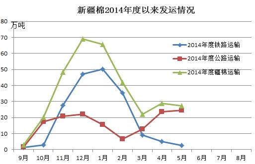 由于公路運輸價格和速度的優(yōu)勢,5月份公路運輸量繼續(xù)增加,鐵路運輸量下降。當(dāng)月出疆棉合計27.3萬噸,環(huán)比減少1.43萬噸,其中鐵路出疆2.7萬噸,環(huán)比減少2.5萬噸;公路出疆24.6萬噸,環(huán)比增加1.07萬噸。截至5月,本年度(2014年9月-2015年5月)疆棉共發(fā)運出疆326.48萬噸,其中鐵路出疆181.6萬噸,公路出疆144.88萬噸。