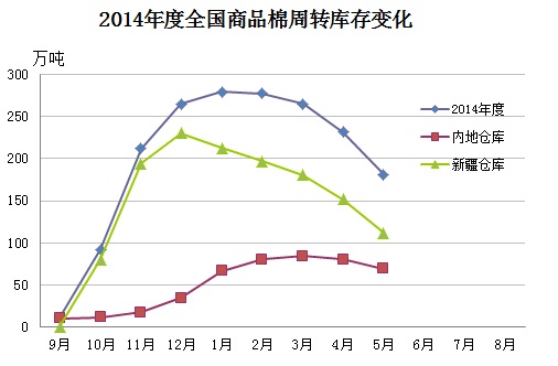 截至5月底,新疆區(qū)內(nèi)42家倉庫商品棉周(中)轉(zhuǎn)庫存為112.08萬噸,環(huán)比減少39.32萬噸,減幅26%。
