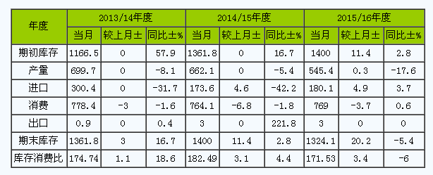 6月份,國家棉花市場監(jiān)測系統(tǒng)對國內(nèi)產(chǎn)銷存預(yù)測數(shù)據(jù)做以下調(diào)整:調(diào)增2014/15年度國內(nèi)棉花進(jìn)口量4.6萬噸至173.6萬噸,調(diào)減消費(fèi)量6.8萬噸至764.1萬噸,2014/15年度國內(nèi)棉花期末庫存增加11.4萬噸至1400萬噸,期末庫存消費(fèi)比為182.5%,較上月提高3.1個(gè)百分點(diǎn)。調(diào)減2015/16年度國內(nèi)棉花消費(fèi)量3.7萬噸至769萬噸,2014/15年度國內(nèi)棉花期末庫存增加11.4萬噸至1400萬噸,期末庫存消費(fèi)比為171.5%,較上月提高3.4個(gè)百分點(diǎn)。