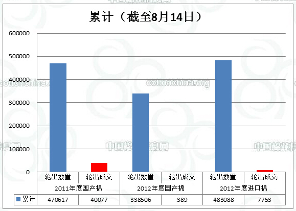 8月14日儲(chǔ)備棉輪出數(shù)量為50533.5024噸,實(shí)際成交1589.3934噸,成交比例3.15%。參與涉及競(jìng)買成功的企業(yè)共計(jì)5家。據(jù)中國棉花信息網(wǎng)統(tǒng)計(jì),截至8月14日儲(chǔ)備棉輪出累計(jì)成交48217.5512噸,成交比例3.73%。