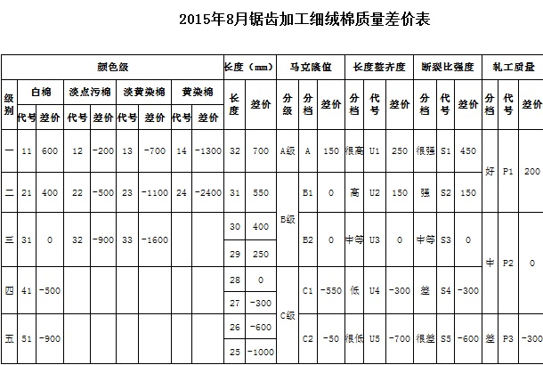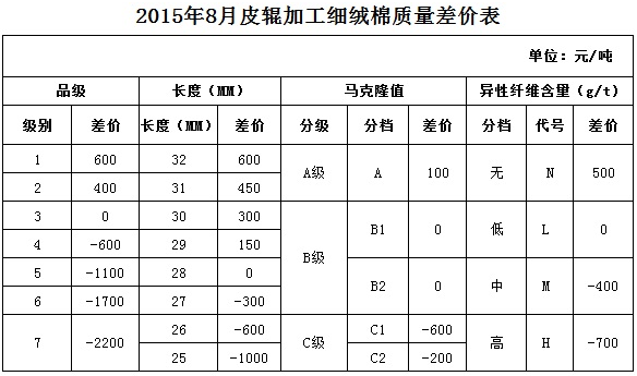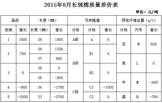 為方便儲(chǔ)備棉輪出結(jié)算,2015年8月《中國(guó)棉花質(zhì)量差價(jià)表》保持不變,各指標(biāo)價(jià)差幅度維持7月份水平。