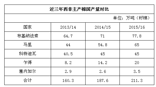 根據(jù)美國農(nóng)業(yè)參贊的最新報告,2014/15年度西非棉花產(chǎn)量約180萬噸(籽棉,下同),同比增長17%,比USDA預(yù)測的數(shù)據(jù)增長了2%。其中布基納法索棉花產(chǎn)量最高,為71萬噸,同比增長9.7%,其次分別是馬里54.8萬噸,同比增長24.5%;科特迪瓦45萬噸,同比增長11%;乍得14.2萬噸,同比增長73%;塞內(nèi)加爾2.6萬噸,同比減少10%。由于2015/16年度初期雨水充沛,預(yù)計棉花產(chǎn)量將同比增長13%,約210萬噸。