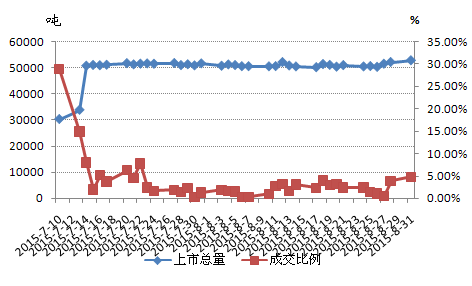 從期貨市場觀察,自儲備棉輪出工作開展以來,皮棉市場供應(yīng)越發(fā)充裕,在供大于需的行情背景下,棉花期貨價格一路走低。8月31日,鄭棉主力合約CF1601收盤價格12360元,較7月1日下跌近1000元,鄭棉期貨價格持續(xù)下跌,致使紡企對后市棉價擔憂加重,不敢大批量采購,并且低價倉單棉吸引部分紡企接手,抑制儲備棉成交?! ?/p>