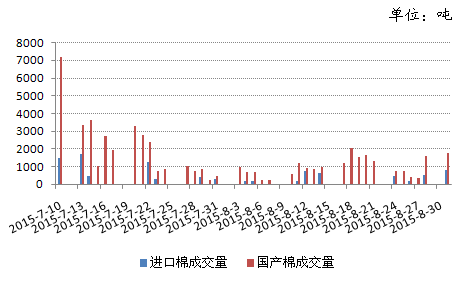截至2015年8月31日,2014年度儲備棉輪出工作圓滿結(jié)束,本次輪出近兩個月時間,總計劃輪出量為185.47萬噸(每日掛牌累計數(shù)量),實際成交6.34萬噸,總成交率3.42%,其中2011年度國產(chǎn)棉共成交5.27萬噸;進口棉成交0.97萬噸;2012年度國產(chǎn)棉因價格過高,質(zhì)量一般,總成交量不足1000噸。由成交情況來看,每日成交率由首日的28.74%迅速下降到5%以下,最高成交價格為15890元/噸,最低成交價格為10780元/噸,整體成交量低位徘徊,在下游訂單不旺,棉紗利潤微乎其微,新棉即將上市的情況下,紡企對皮棉采購越發(fā)謹慎。
