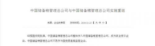國資委公告,經(jīng)報國務(wù)院批準,中國儲備棉管理總公司整體并入中國儲備糧管理總公司,成為其全資子企業(yè)。中國儲備棉管理總公司不再作為國資委直接監(jiān)管企業(yè)。