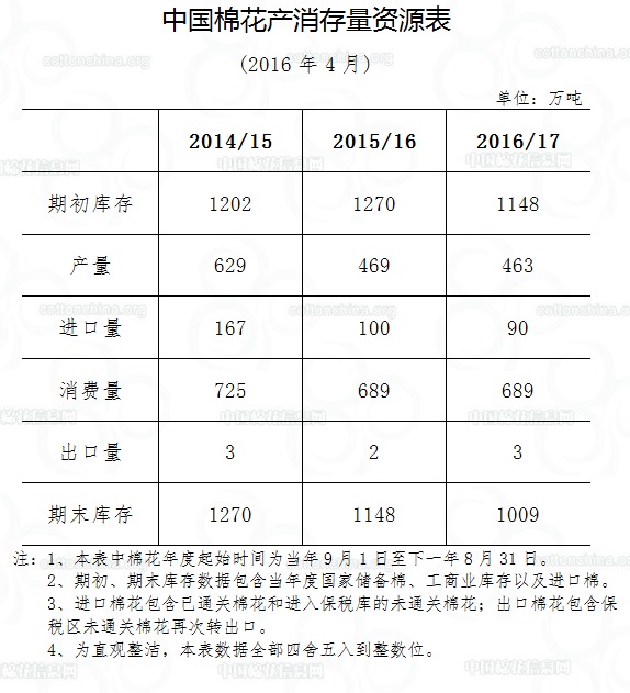 中國(guó)棉花產(chǎn)消存量資源表(2016年4月)