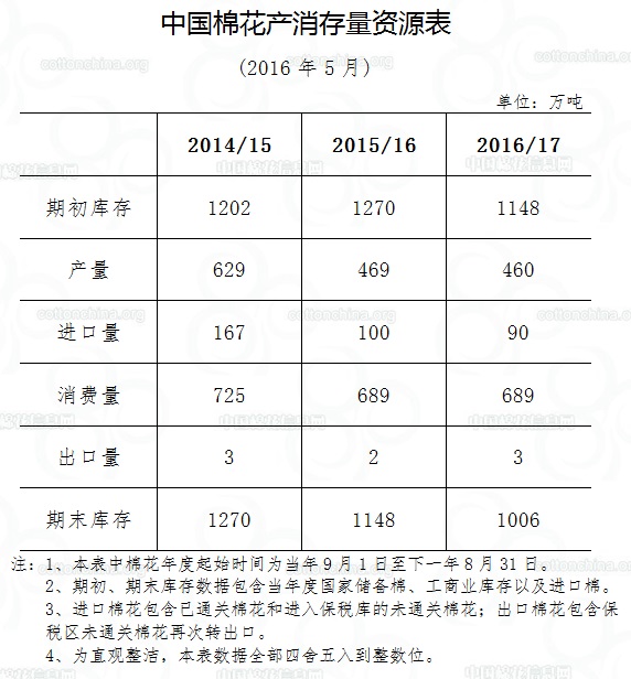 中國棉花產(chǎn)消存量資源表(2016年5月)