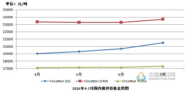 如上圖所示,4-7月國(guó)內(nèi)棉紗價(jià)格有所上漲,其中C32S漲幅最大,前后價(jià)差1000元/噸以上,同期棉花價(jià)差則達(dá)到2000元/噸以上,而鄭棉漲幅更是從10000元/噸左右低位升至15000元/噸以上。棉紗價(jià)格漲幅明顯低于棉花,紡企利潤(rùn)受到擠壓。