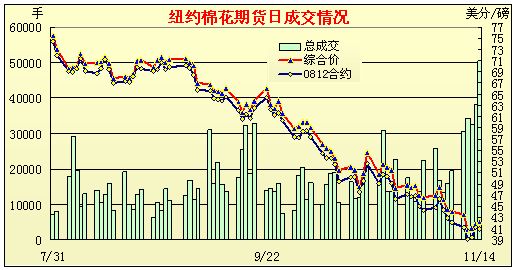 紐約棉花期貨一路下滑,全線破50美分,成交放量,減倉明顯。14日紐約期棉主體價收于42.21美分,較10月末跌430點,跌幅9.2%。日均成交27703手,比10月份上升71.7%。持倉總量14.32萬手,比10月末減倉3.13手,為06年來倉位量最低。不過上周末的三個交易日行情有所趐尾,底部盤升。