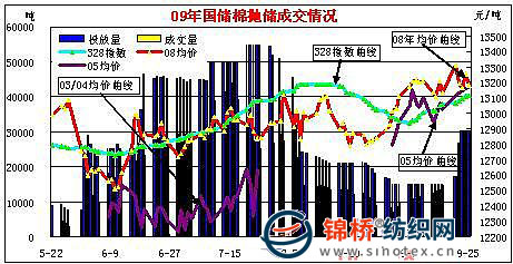 國儲棉的成交價與拋儲數(shù)量、倉儲結(jié)構(gòu)、參拍企業(yè)實力狀況、棉花質(zhì)量及需求密切相關(guān)。一是與投放數(shù)量成反比。當(dāng)投放數(shù)少,則競價激烈,價格明顯攀升,如9月份投放數(shù)量比8月份減少三成以上(下降32.3%),成交率比8月份年升20.9個百分點,成交價平均上漲1.8%;二是與倉儲地密切相關(guān)。當(dāng)倉儲地就近用棉單位且服務(wù)較好的,競價更是激烈,企業(yè)不惜代價,多次出現(xiàn)臨收市前最后加價獲取,導(dǎo)致價格攀漲有的甚至高得離譜,9月份投放的國儲中,減少了甘肅、新疆等倉儲地棉,增加內(nèi)地尤其是用棉單位相對集中的倉儲棉,08年度328級達(dá)到13700元左右,有的超過14000元,05年度527級棉大部分在13200-13400元之間;三是與棉花質(zhì)量相關(guān),今年競價過程中,03-05陳棉倍受關(guān)注,所投放的陳棉幾乎全部成交,加價幅度均在1000元以上;四是具有棉花收購和加工能力的紡織企業(yè),由于前期籽棉收購成本較低,因此在競拍時重量而不重價,只是為獲取資源補償。按照國家第一批投放152.3萬噸結(jié)束后和第二批60萬噸總計212.3萬噸的計劃,截止9月25日還余31.95萬噸,按每天3萬噸投入,節(jié)后還有9-10個交易日,預(yù)計競價仍將十分激烈。
