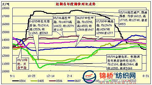 綜合近期國際市場環(huán)境、棉花需求、新棉收購、紡織企業(yè)承受能力及國家發(fā)改委調(diào)控棉花市場的基本思想和措施,預(yù)計國內(nèi)棉花市場將維持窄幅波動的平穩(wěn)運行。一是拋儲即將結(jié)束,從9月份競價過程看,雖然9月份止跌上漲,但上漲得也很艱難,漲幅不十分明顯,表明已接近紡織企業(yè)承受極限。二是發(fā)改委表示,將繼續(xù)加強宏觀調(diào)控,防止棉價大幅波動。三是國際市場不穩(wěn)定,紡織品出口,尤其是紗線出口形勢不容樂觀,同時內(nèi)需市場還受到進(jìn)口棉紗激增的沖擊??s上原因,棉價上漲有壓力,但下跌空間也有限,因為新棉收購成本明顯高于去年,估計今年棉價總體走勢可能沿07/08年度軌跡運行(附近期各年度國內(nèi)棉價走勢圖如下)。滌綸短纖已基本觸底,但因原料繼續(xù)走弱及滌短生產(chǎn)企業(yè)減庫促銷,預(yù)計近期還將有可能小幅下探。粘膠短在資源不足、下游需求減弱及短絨上漲多因素影響,將繼續(xù)維持窄幅震蕩平穩(wěn)運行。 |
