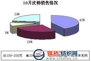 調(diào)查顯示,存棉企業(yè)中,44%的企業(yè)全部存有地產(chǎn)棉;25%的企業(yè)全部存有新疆棉,另有21%的企業(yè)存有地產(chǎn)棉和新疆棉。還有10%的企業(yè)地產(chǎn)、新疆、外棉都存有。存棉等級(jí)主要以3、4級(jí)棉為主。 3.企業(yè)入市時(shí)機(jī)不同 銷售利潤(rùn)情況不等 截止10月底大部分棉花企業(yè)都已經(jīng)集中入市收購(gòu)加工,由于企業(yè)入市場(chǎng)時(shí)間早晚不同,而收購(gòu)成本和加工成本累加不等,企業(yè)的銷售利潤(rùn)均不一樣,差異比較明顯。從具體情況看,銷售利潤(rùn)占100-200元的企業(yè)較普遍,占被調(diào)查樣本的42%;200-500元的企業(yè)占26%;保本無(wú)利的企業(yè)占24%;還有8%的企業(yè)銷售利潤(rùn)在500元以上;基本沒有虧本銷售的情況。