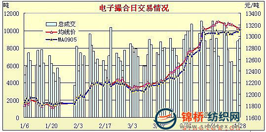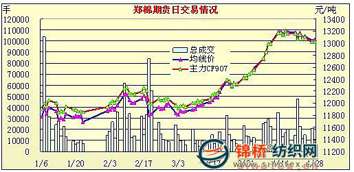 2.現(xiàn)貨拉動(dòng),國(guó)內(nèi)棉花期貨攀升后高位盤整。國(guó)內(nèi)期貨自3月份緩慢上升后,4月份加速,攀升至13000元/噸后即4月份下半月基本呈高位盤整狀態(tài)。截止4月28日鄭棉期貨主體價(jià)13058元/噸,較3月末漲650元左右,比3月初漲1220元左右。與此同時(shí),電子撮合13141元/噸,比3月末漲500元以上,比3月初漲1000元左右。鄭棉期貨和電子撮合走勢(shì)圖如下: