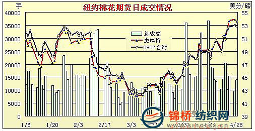 4.紐約棉花期貨大幅反彈,補(bǔ)足2月份下跌缺口。受外圍市場(chǎng)逐漸走強(qiáng),美棉出口增加和中國(guó)國(guó)內(nèi)棉價(jià)大幅拉升影響,4月份紐約棉花期貨大幅反彈,截止4月28日紐約棉花期貨各合約主體價(jià)53.63美分/磅,較3月末大漲670余點(diǎn),漲幅達(dá)14.3%,彌補(bǔ)此前2月份大跌780點(diǎn)跌幅缺口。