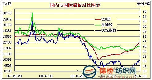 5.內(nèi)棉持續(xù)上漲,內(nèi)外棉價(jià)價(jià)差仍較明顯。從下圖國(guó)內(nèi)國(guó)際棉價(jià)對(duì)比走勢(shì)情況看,由于國(guó)內(nèi)棉價(jià)自2008年12月份以來持續(xù)上漲,外棉4月份大幅反彈補(bǔ)缺,內(nèi)外棉價(jià)差仍達(dá)2300元左右。目前我國(guó)內(nèi)現(xiàn)貨棉價(jià)約合72.7美分/磅,比現(xiàn)行國(guó)際棉價(jià)59.25美分/磅高出22.7%,折人民幣每噸高出2300元左右。進(jìn)口棉比價(jià)優(yōu)勢(shì)明顯,但按滑準(zhǔn)稅率計(jì)算則基本與國(guó)內(nèi)棉價(jià)相差無幾。