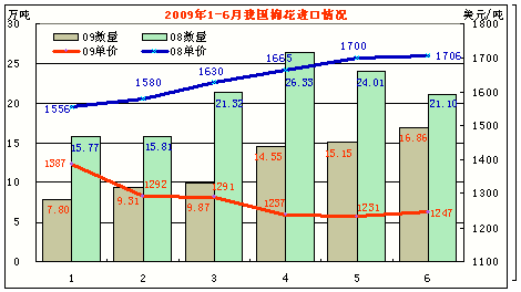據(jù)海關(guān)統(tǒng)計(jì),今年6月份我國棉花進(jìn)口16.86萬噸,同比下降20.1%,環(huán)比上升11.3%。進(jìn)口平均單價(jià)1247美元/噸,同比下降26.9%,折人民幣為8523/噸,同比下降27.6%。