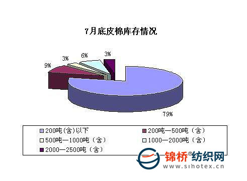 7月國(guó)內(nèi)棉花市場(chǎng)資源更加緊張,為穩(wěn)定市場(chǎng),國(guó)儲(chǔ)棉拍賣(mài)力度明顯加大,但是拍儲(chǔ)價(jià)較6月仍然有明顯上升?,F(xiàn)貨市場(chǎng)月初相對(duì)穩(wěn)定,月中后期隨著拍儲(chǔ)價(jià)提高出現(xiàn)上漲。7月份受7.5事件影響,新疆棉外運(yùn)困難,這加劇內(nèi)地資源緊張局面,月內(nèi)競(jìng)購(gòu)儲(chǔ)備棉成為大中型紡織企業(yè)紡織用棉主要來(lái)源。自7月20日起暫停紡織企業(yè)委托棉花流通企業(yè)交易商代理購(gòu)買(mǎi)國(guó)儲(chǔ)棉,同時(shí)上市資源量增加,有效緩解拍儲(chǔ)企業(yè)競(jìng)價(jià)激烈程度,月末價(jià)格波動(dòng)趨緩。為全面了解企業(yè)庫(kù)存、銷(xiāo)售及市場(chǎng)資金等情況,進(jìn)行此次調(diào)查,現(xiàn)將調(diào)查結(jié)果公布如下: 1.商業(yè)庫(kù)存總量90萬(wàn)噸。 通過(guò)對(duì)棉花企業(yè)進(jìn)行分省、分規(guī)模抽樣調(diào)查,據(jù)統(tǒng)計(jì),截止2009年7月底國(guó)內(nèi)棉花商業(yè)庫(kù)存總量90萬(wàn)噸(包括外棉,不包括國(guó)儲(chǔ)棉),較6月底的79萬(wàn)噸增加11萬(wàn)噸。其中內(nèi)地商業(yè)庫(kù)存68萬(wàn)噸,新疆商業(yè)庫(kù)存(未出疆)22萬(wàn)噸。內(nèi)地產(chǎn)區(qū)中,黃河流域的冀魯豫3省共有庫(kù)存39萬(wàn)噸,長(zhǎng)江流域的蘇皖鄂湘4省共有庫(kù)存27萬(wàn)噸,其他分散產(chǎn)區(qū)2萬(wàn)噸。 2.紡織用棉以競(jìng)拍儲(chǔ)備棉為主,棉企庫(kù)存趨于分散。 7月份受拍儲(chǔ)價(jià)走高影響,月中前期棉花企業(yè)存在惜售現(xiàn)象,同時(shí)紡織企業(yè)把儲(chǔ)備棉作為主要采購(gòu)來(lái)源,因此內(nèi)地存棉棉花企業(yè)實(shí)際出貨力度不大。調(diào)查獲悉,截至7月末被調(diào)查的35%的棉花企業(yè)還儲(chǔ)有庫(kù)存。儲(chǔ)有庫(kù)存的企業(yè)中,200噸以下的占68%;200-500噸的占21%;500-1000噸的占3%;1000-2000噸的占5%;2000-2500噸的占3%。(見(jiàn)下圖)