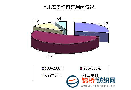 3.企業(yè)銷(xiāo)售利潤(rùn)有所提升。 7月份由于棉價(jià)持續(xù)上漲,棉花流通企業(yè)銷(xiāo)售利潤(rùn)多有所提升,被調(diào)查企業(yè)中,利潤(rùn)在200-500元的企業(yè)占55%,較上月增加42個(gè)百分點(diǎn);100-200元的占28%,較上月減少15個(gè)百分點(diǎn);500元以上的占11%,較上月減少2個(gè)百分點(diǎn);保本的占6%,較上月減少25個(gè)百分點(diǎn)。(見(jiàn)下圖)