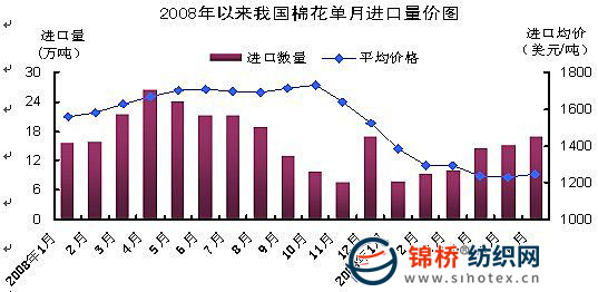 據(jù)海關(guān)統(tǒng)計(jì),2009年上半年我國進(jìn)口棉花73.5萬噸,價(jià)值9.3億美元,分別比2008年同期(下同)下降40.8%、54.4%。其進(jìn)口的主要特點(diǎn)有: 一、月度進(jìn)口量持續(xù)回升,進(jìn)口均價(jià)止跌企穩(wěn)。2009年以來我國棉花進(jìn)口量呈逐月回升態(tài)勢,6月當(dāng)月進(jìn)口16.9萬噸,同比下降20.1%,環(huán)比增長11.2%。進(jìn)口平均價(jià)格在低位徘徊之后企穩(wěn)回升,6月進(jìn)口均價(jià)每噸1247美元,同比下降26.9%,環(huán)比增長1.3%(下圖)。