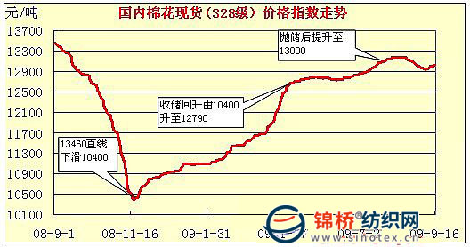 【本網(wǎng)專稿】受金融危機影響,國際市場萎縮,國內(nèi)市場競爭加劇,紡織企業(yè)需求能力下降,棉花市場十分疲弱,棉花進口聚減,棉價直線下滑。為穩(wěn)定棉花市場,國家先后采取大規(guī)模收儲和拋儲的宏觀調(diào)控措施,并貫穿整個棉花年度。在國儲棉政策引領(lǐng)下,國內(nèi)棉價演義出先跌后漲的巨幅波動行情。調(diào)控在穩(wěn)定棉花市場的同時,也遠遠超出紡織企業(yè)邊際成本,紡織企業(yè)效益每況愈下,棉農(nóng)增產(chǎn)不增收。 一、2008/09年度棉花市場回顧 1.基本面情況 受國際金融危機影響,2008/09棉花年度紡織紗線生產(chǎn)增速明顯減緩,紡織品服裝出口下降,棉花需求減弱,棉花進口大幅下降。本年度棉花總產(chǎn)750萬噸,比上年度微降1.6%;紗線2249萬噸,比上年度增長5.9%,增速大幅下降;棉花消耗約1300萬噸,產(chǎn)需缺口550萬噸左右;棉花進口144.65萬噸,比上年度下降40.7%,為2003/04年度來進口量最低水平;本年度紡織品服裝出口1711.5億美元,比上年度下降5.5%,按當期匯率折算,出口折人民幣7166.26億元,比上年度下降14%,這是自1999年來紡織品服裝出口年度首次出現(xiàn)負增長。 受基本面欠缺,尤其是國際市場持續(xù)低迷影響,本年度棉花市場顯得十分疲弱。為穩(wěn)定國內(nèi)棉花市場,國家及時采取積極調(diào)控措施,抑制持續(xù)下滑的棉價,確保紡織企業(yè)基本用棉需求。但是棉價起伏較明顯。 2.國內(nèi)現(xiàn)貨棉價走勢 本年度棉花市場在調(diào)控前后基本呈“V”字形走勢,起伏之大僅次于2003/04棉花年度波動幅度。棉價走勢大體分直線下滑、持續(xù)回升、平穩(wěn)過度3個階段。