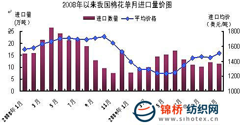 據(jù)海關(guān)統(tǒng)計(jì),今年1-11月我國進(jìn)口棉花131萬噸,價(jià)值17.6億美元,分別比去年同期(下同)下降32.6%和45.6%;進(jìn)口平均價(jià)1343美元/噸,下跌19.4%。