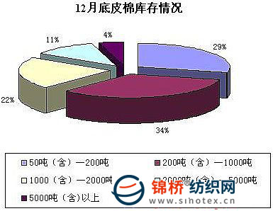 12月國內(nèi)棉花現(xiàn)貨價格仍然有小幅上漲,但是相比前2月上漲速度明顯減緩。由于拋儲仍然在進(jìn)行,棉企對后市存在爭議等原因,該月一些企業(yè)仍然囤積待售,再加上收購仍然在繼續(xù),本月商業(yè)庫存小幅增加。據(jù)調(diào)查,29%的企業(yè)存棉量在50-200噸,較上月減少8個百分點;34%的在200-1000噸,增加13個百分點;22%的在1000-2000噸,增加7個百分點;11%的在2000-5000噸,減少7個百分點;4%的在5000噸以上,減少5個百分點。(如下圖)